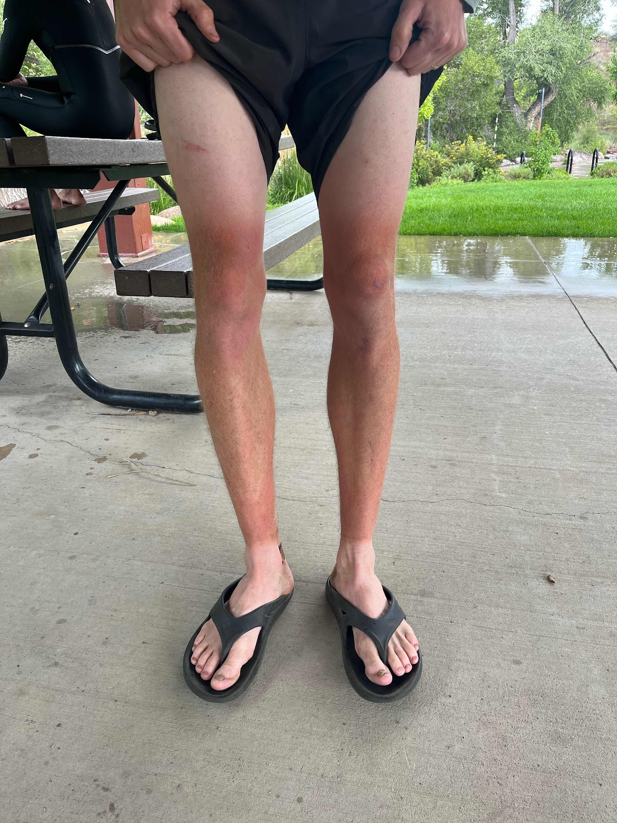We then met cousin Sam at the Animas River, where he was river-surfing in a thunderstorm! I tried to take a pic but the rain hit and Claire and I escaped to a nearby covered pavilion. Here’s a funny pic of my hiking tan: