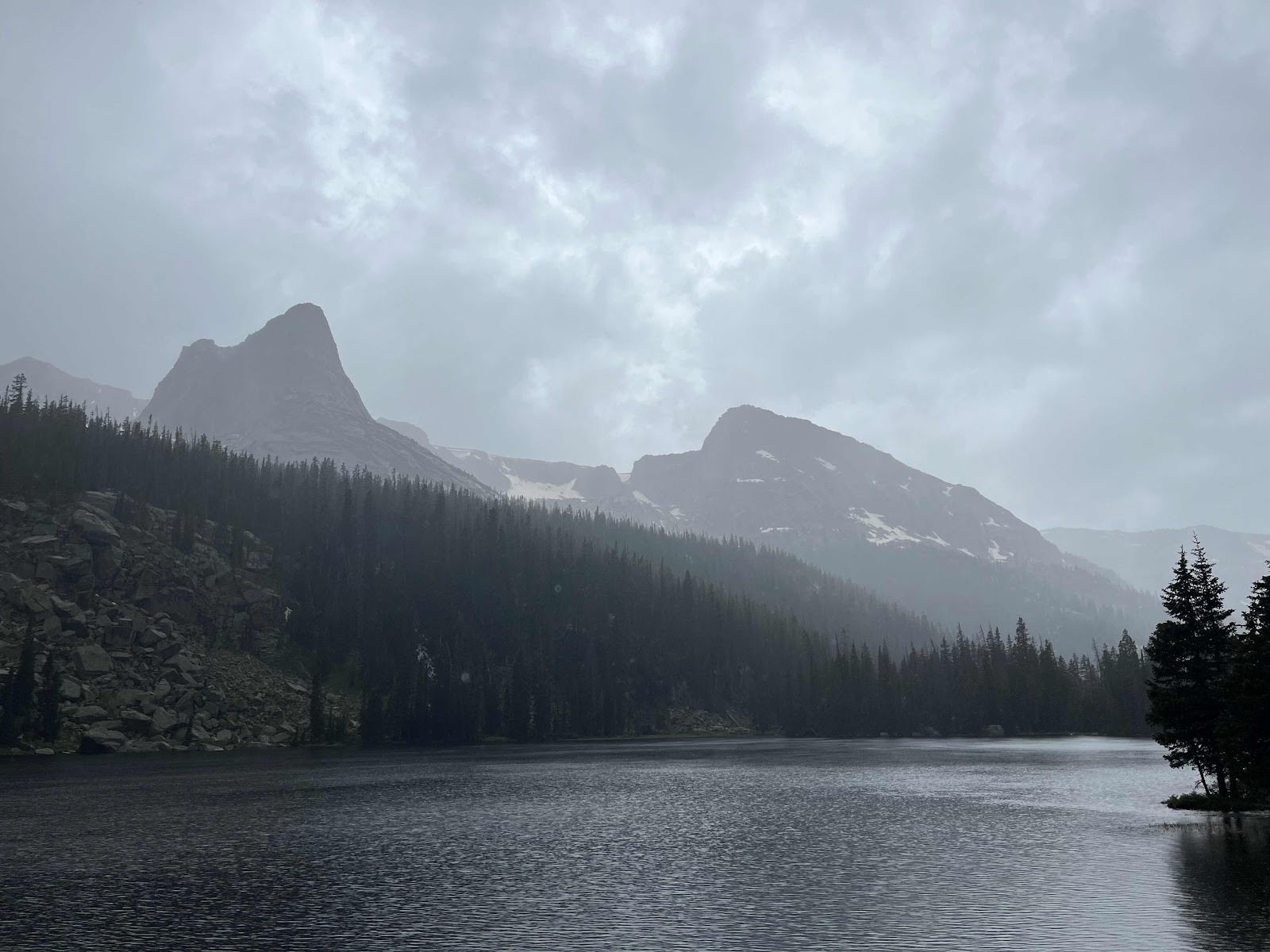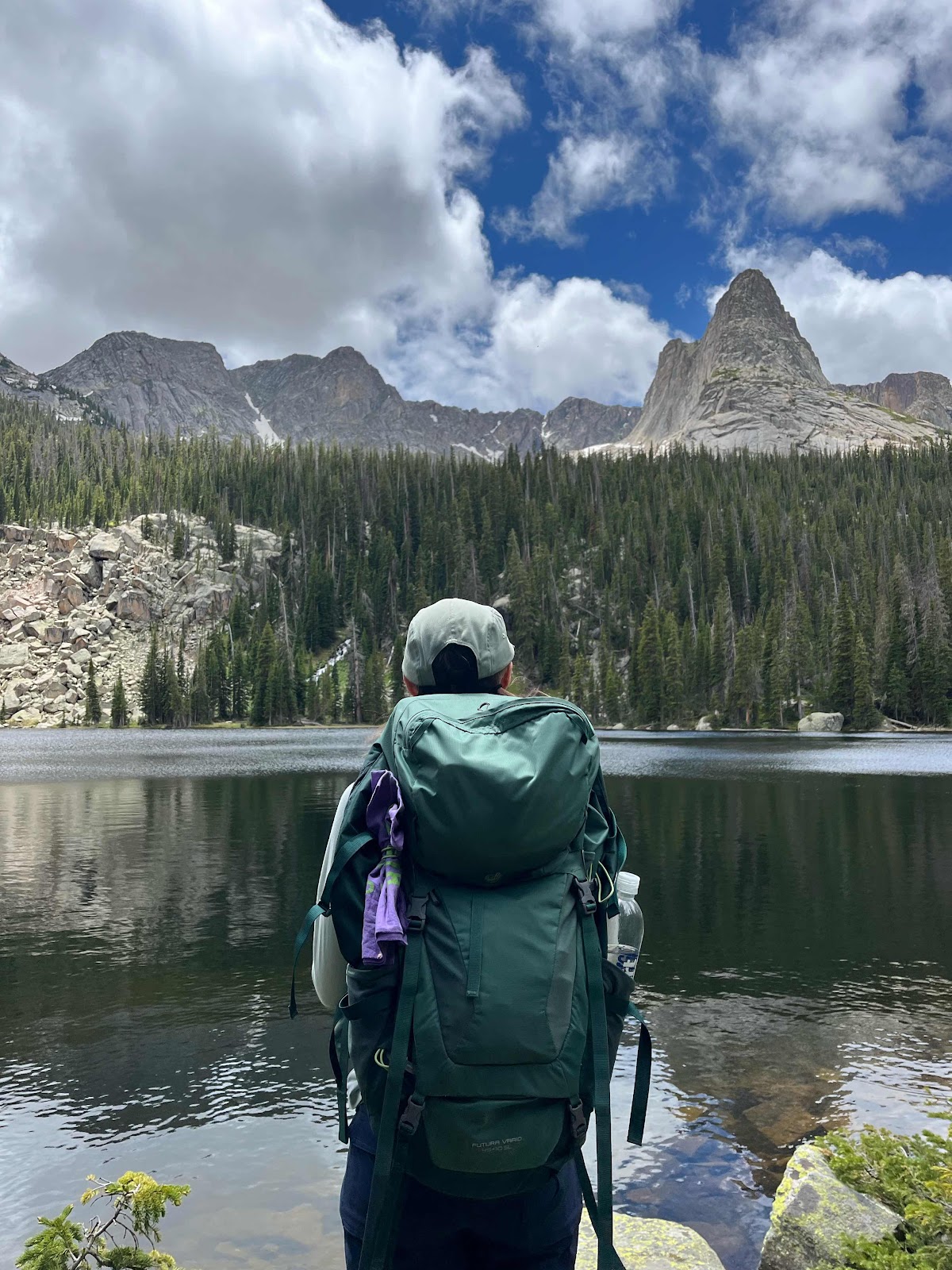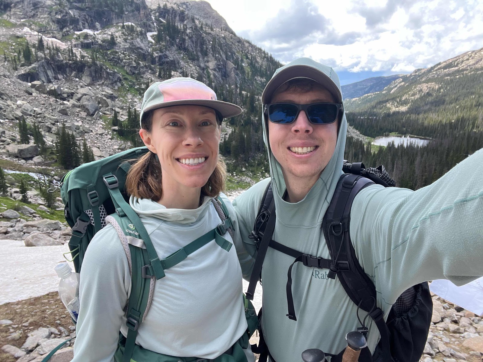 We turned around and headed back down towards the lower lakes. We’re glad we did because as we were approaching the middle lakes the wind started picking up. We stopped to put on our rain gear (mainly for mosquitos) and right when we continued hiking from that stop we got hit with rain!