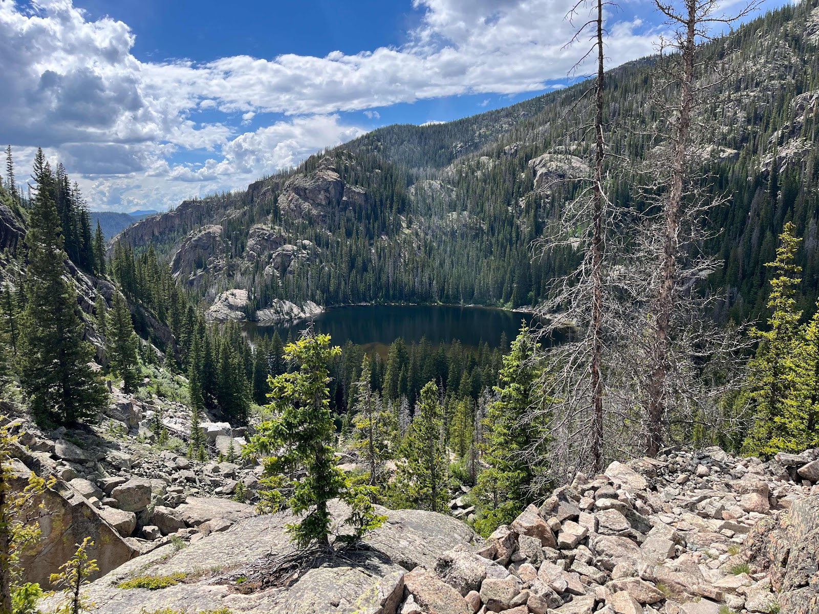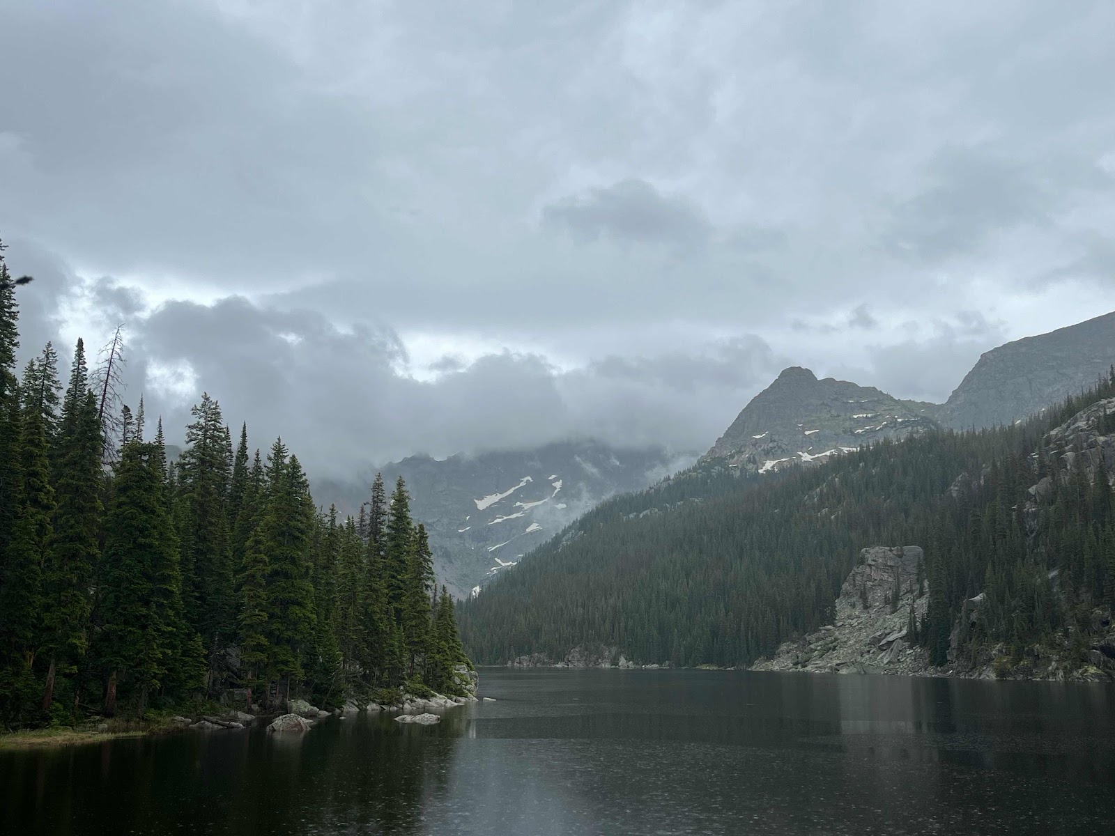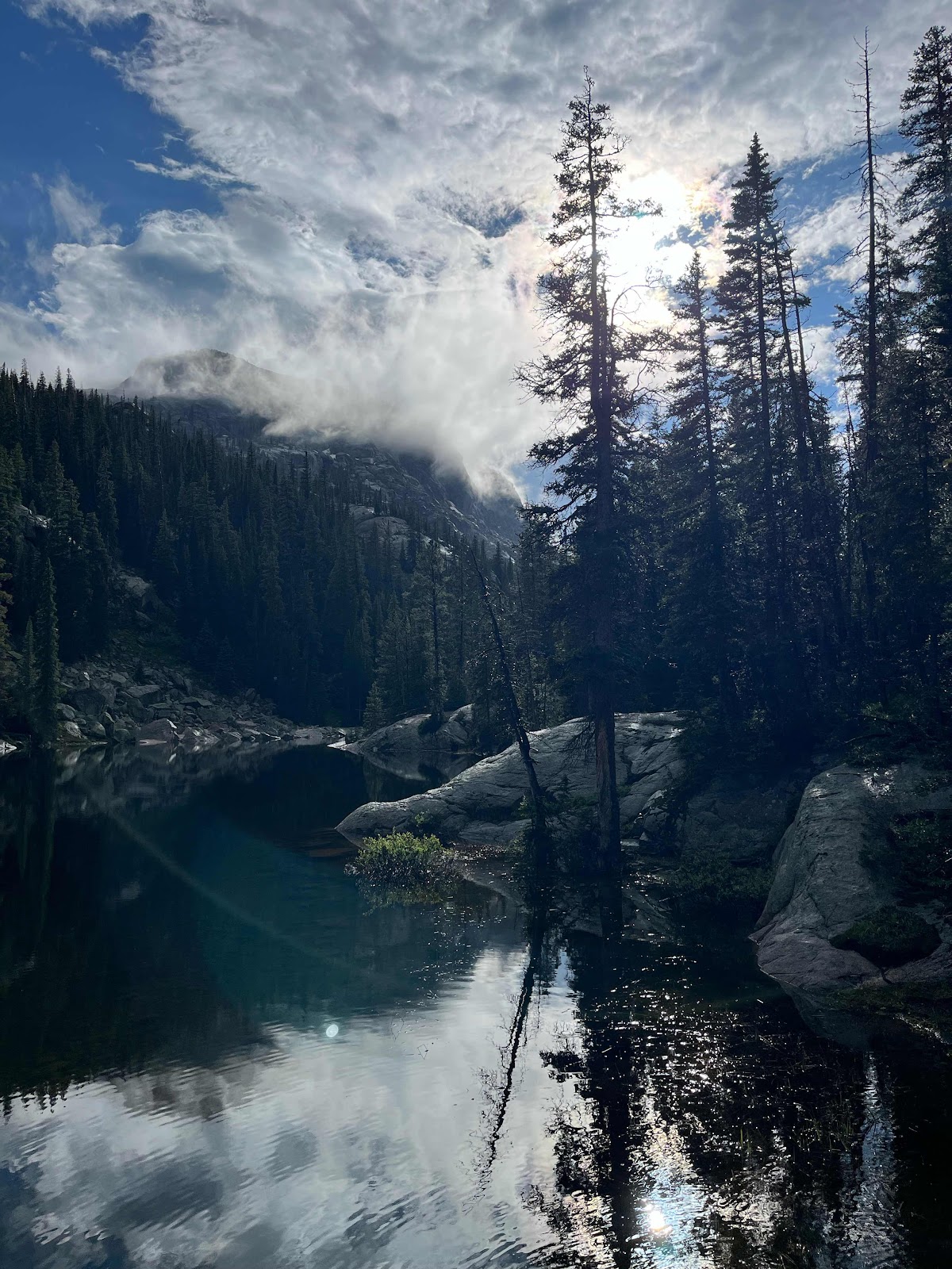 We turned around and headed back down towards the lower lakes. We’re glad we did because as we were approaching the middle lakes the wind started picking up. We stopped to put on our rain gear (mainly for mosquitos) and right when we continued hiking from that stop we got hit with rain!