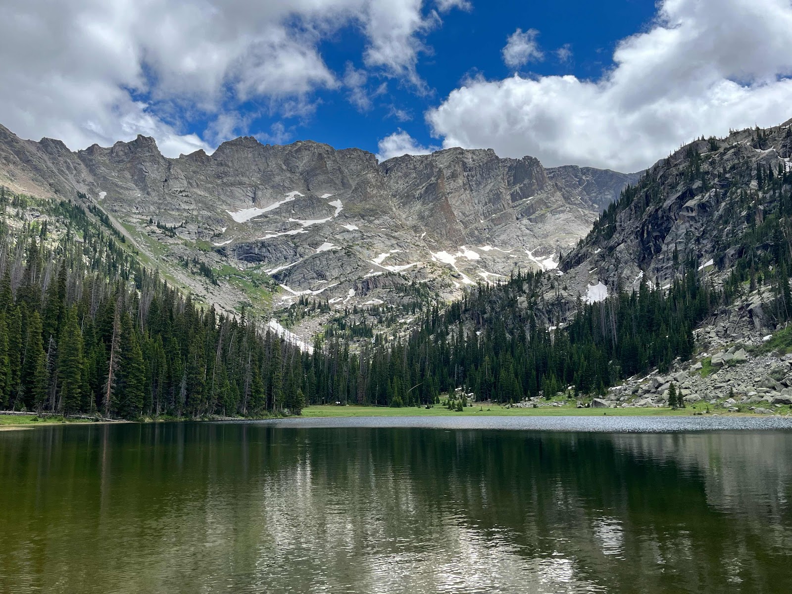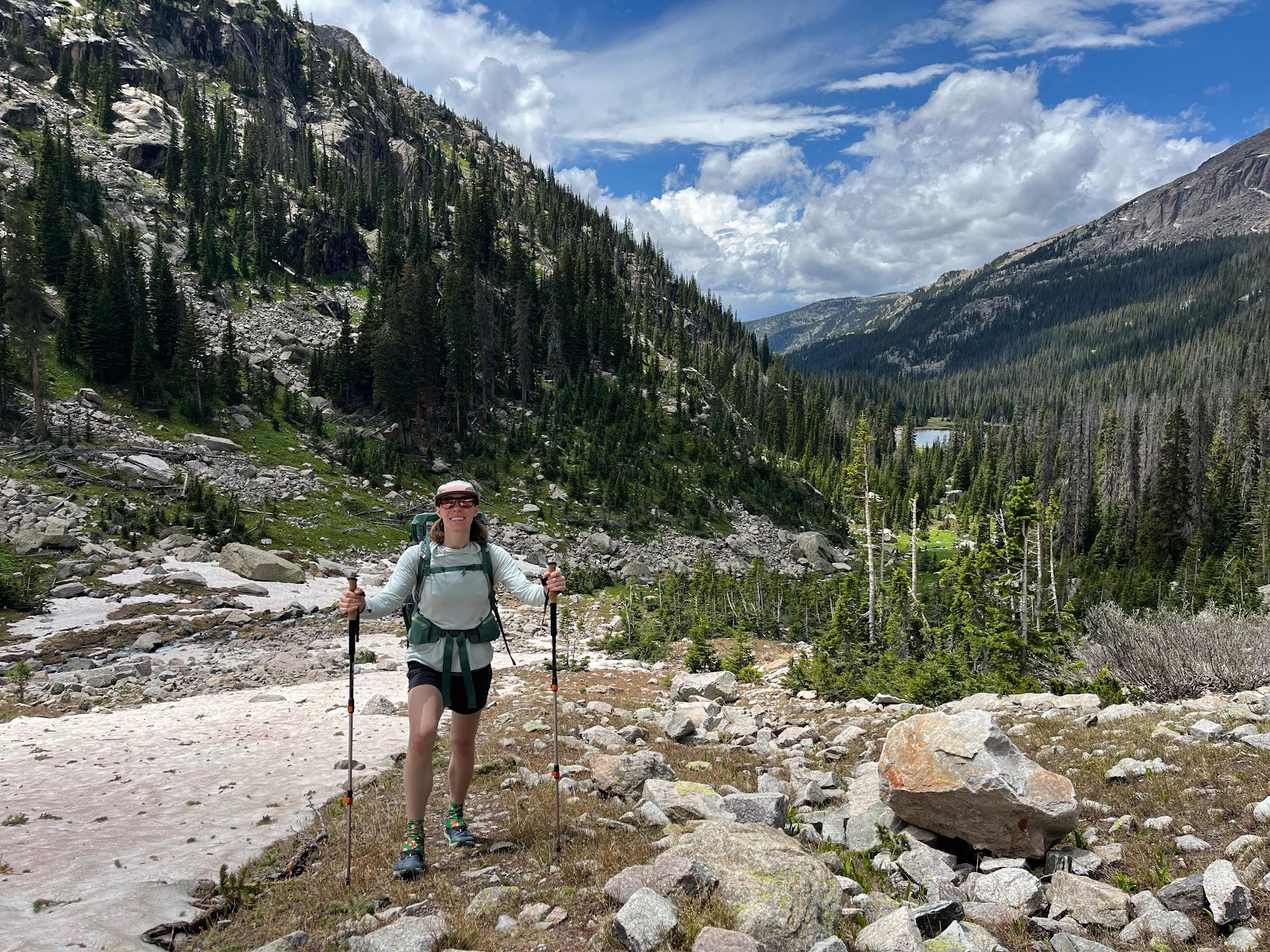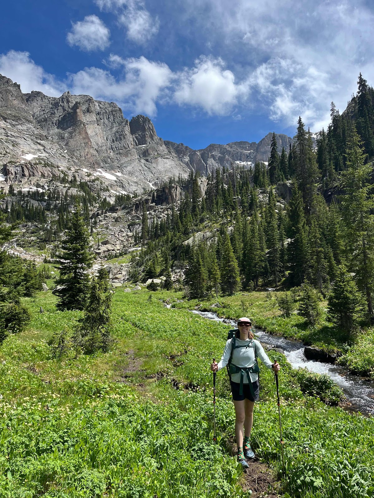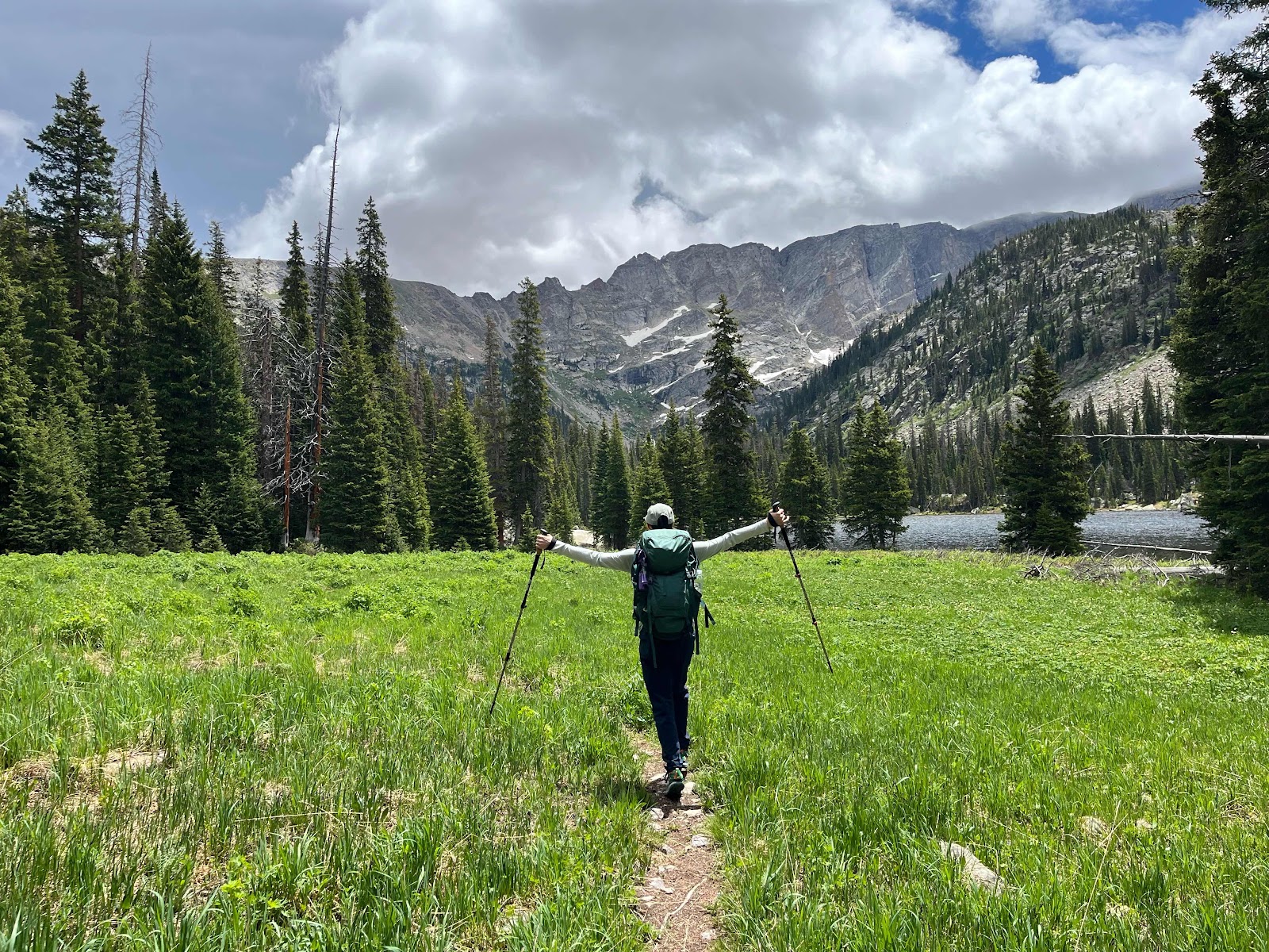 The trail around the lake was tedious and trying, as the lake was full and swollen from snowmelt early season. Surprisingly, once we passed the lake the trail was in great shape for being unmaintained! There were even recent chainsaw cuts from blowdowns. We came across a stunning meadow at third lake and Claire summoned her inner Julie Andrews.