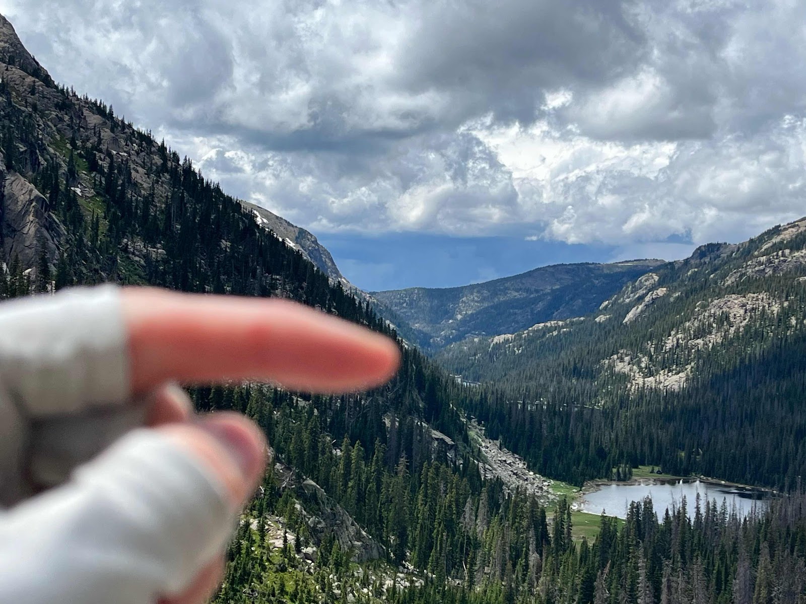 Weird picture I know but to the right of my finger you can see Verna lake where our camp was set up.