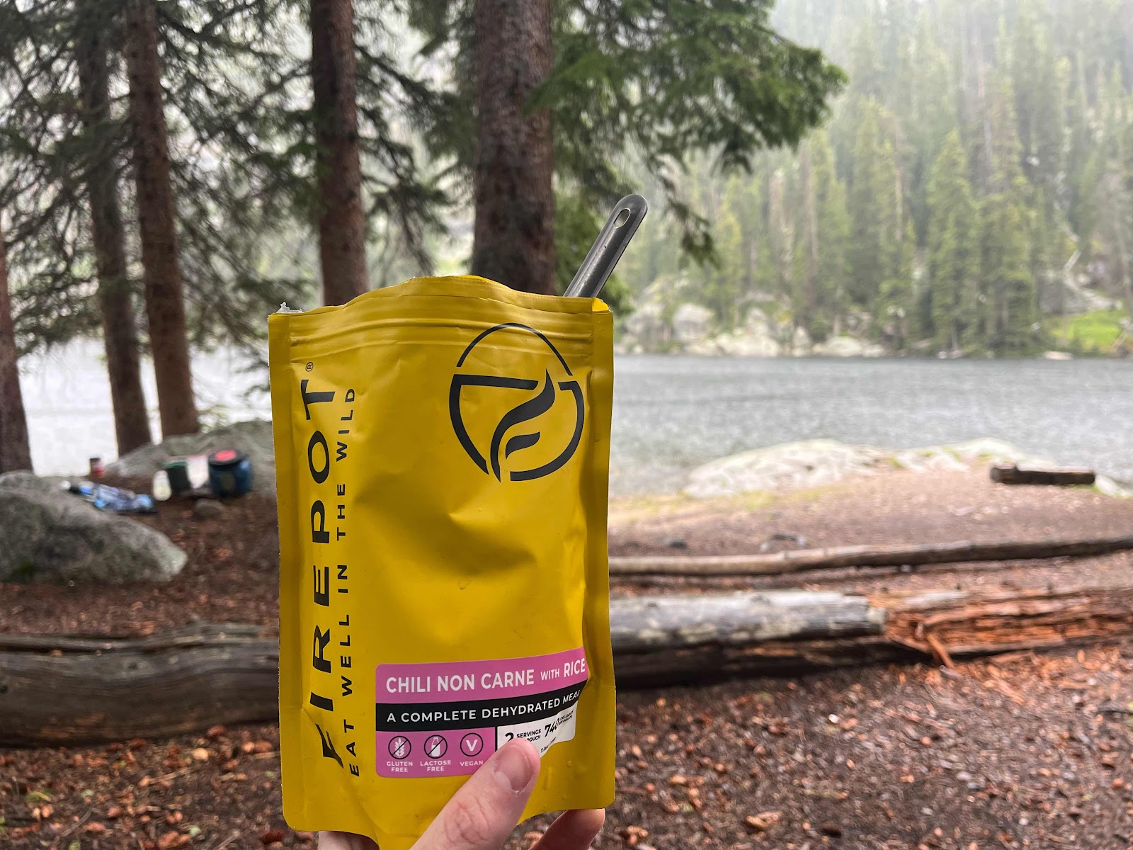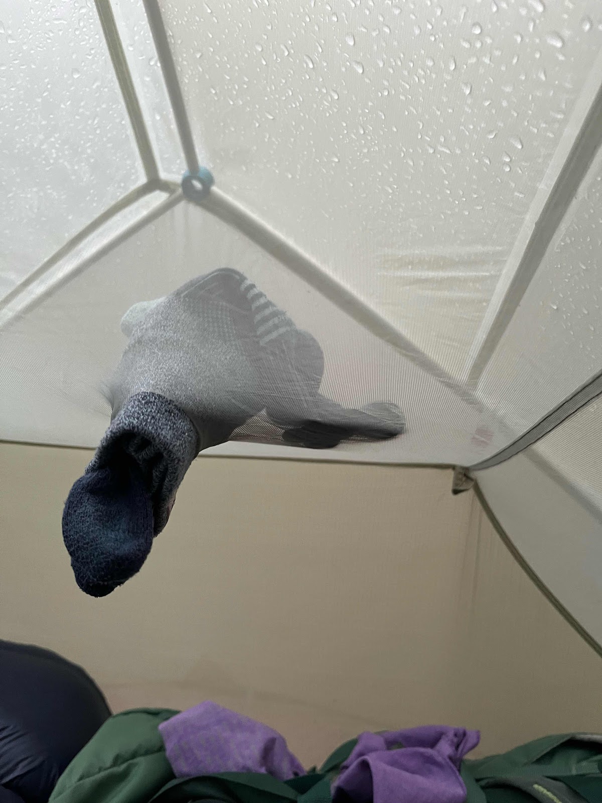 We slept really hard that night and we were hoping for clear skies the next morning to hike out. Unfortunately the weather got pushed back by a day and we had rain all night and into the morning. Claire woke up on her birthday to go get some breakfast and coffee and immediately after she left the tent it hailed on her!