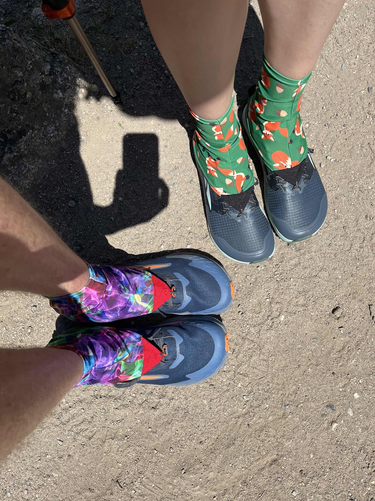 I’m rocking size 13 Altra Timp 5’s with “Trippy” Dirty Girl Gaiters. Claire is sporting size 10.5 Altra Lonepeak 8’s with “What does the fox say” Dirty Girl Gaiters
