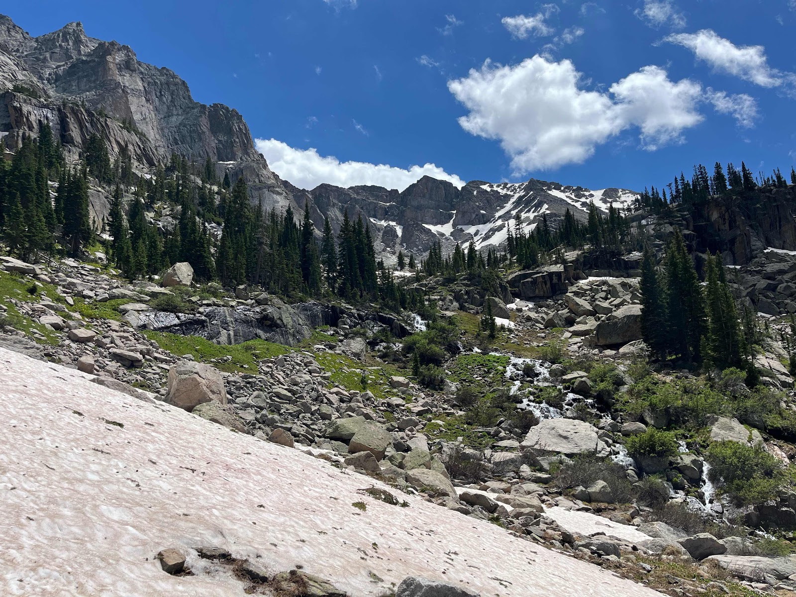 After the fourth lake we climbed alongside a pretty high alpine stream towards the back of the valley. Our plan was to get up and over to the high fifth lake tucked up way up at over 12,000 feet.