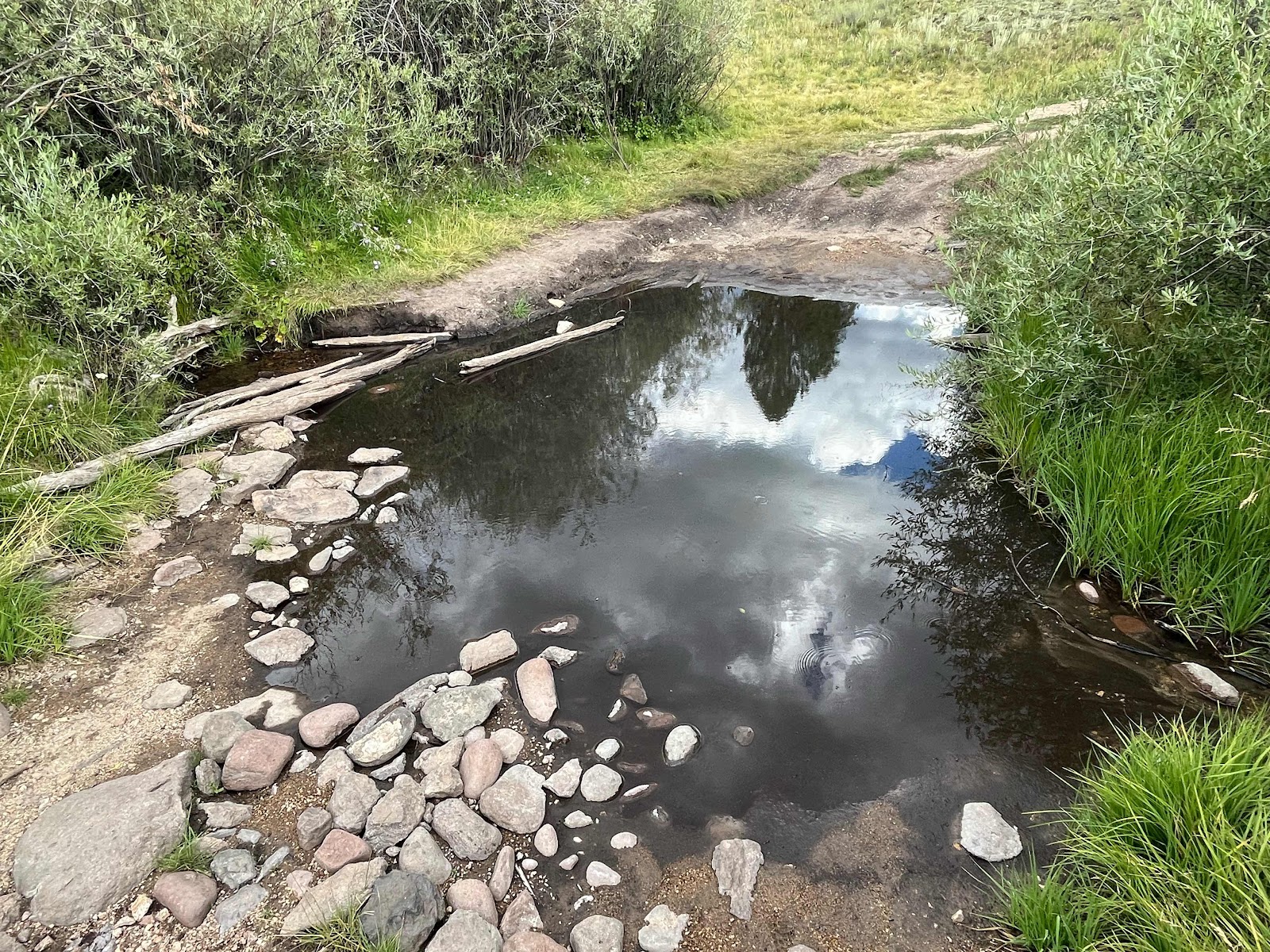This was a legit water source! (A little cleaner feeling to the left across those logs where it first hits the jeep road…) Still yellow though!