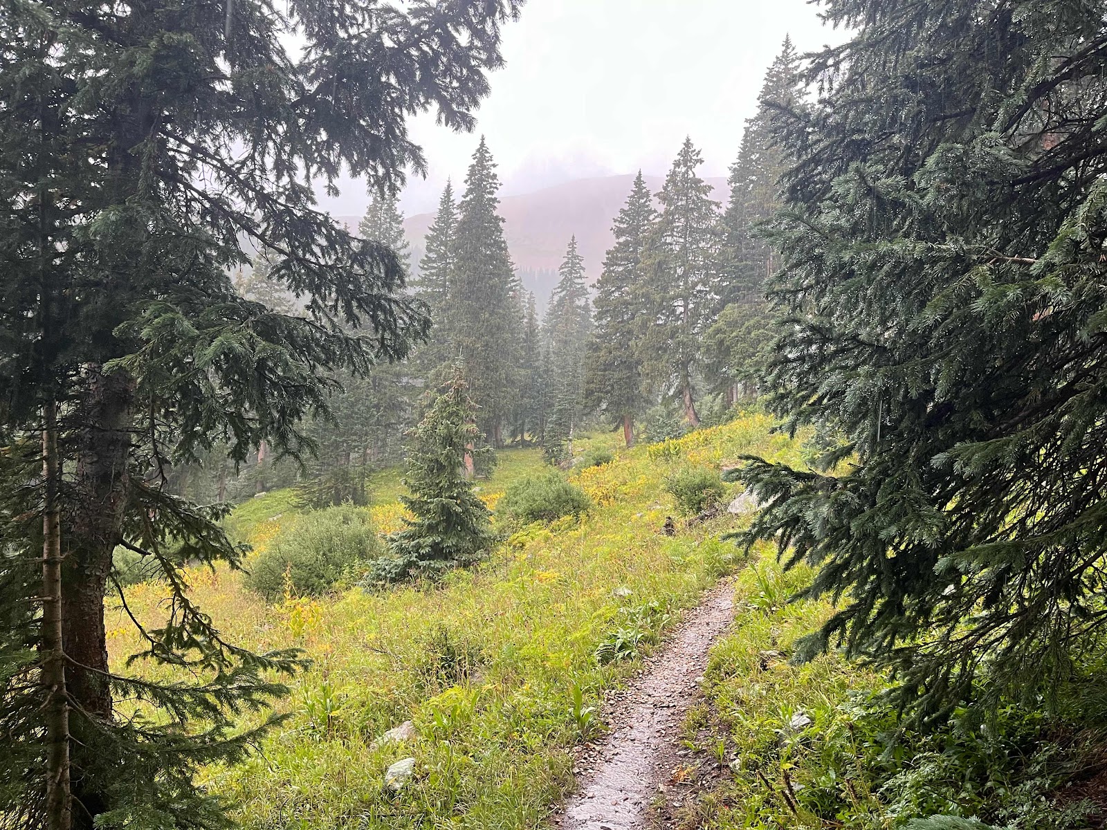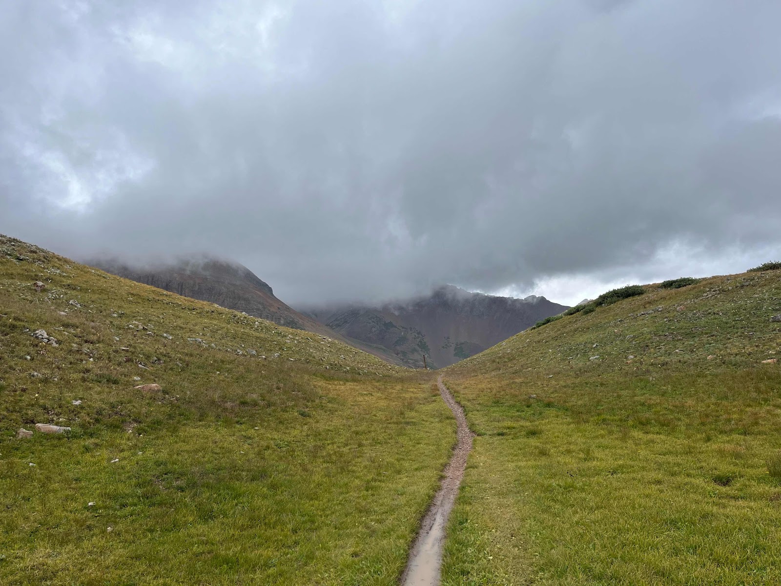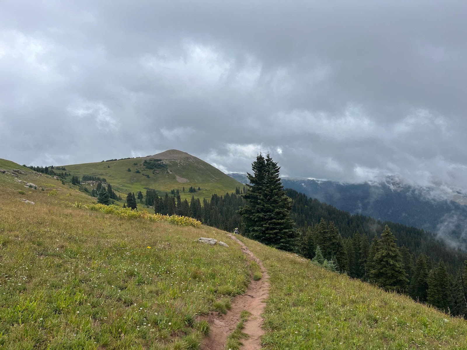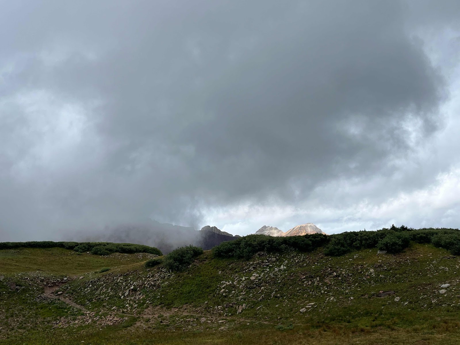 My hands got soaked and were freezing cold even with my rain mitts, and I almost lost full dexterity again in my pinky and ring fingers. I am stoked to be done with this trail soon! I caught Cheeseburgler on the uphilll towards the next pass. Luckily, the weather started clearing up nearing the top and we even had some sunshine on the other side!
