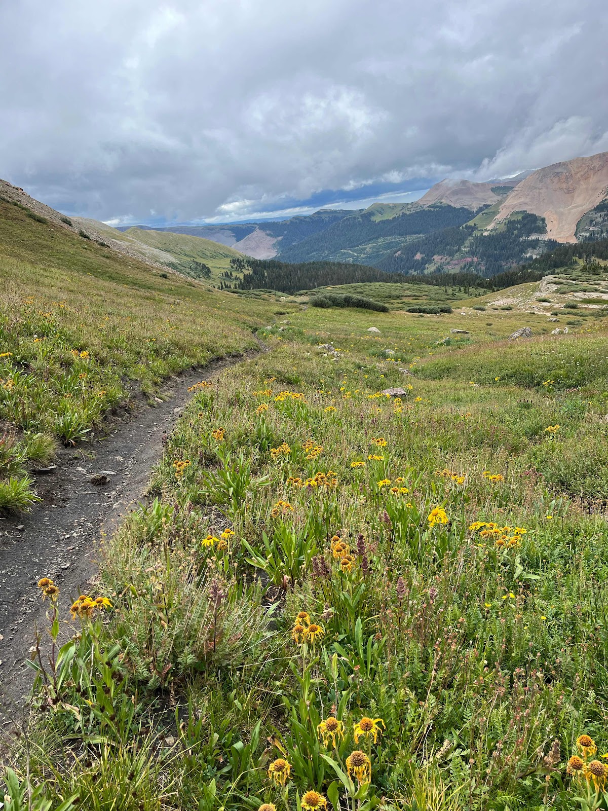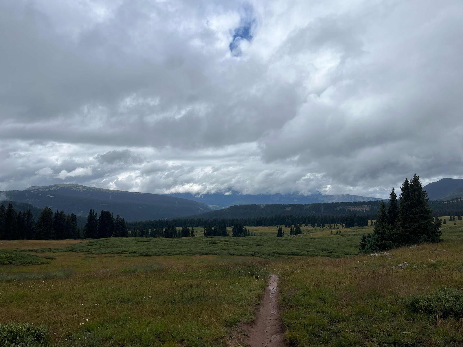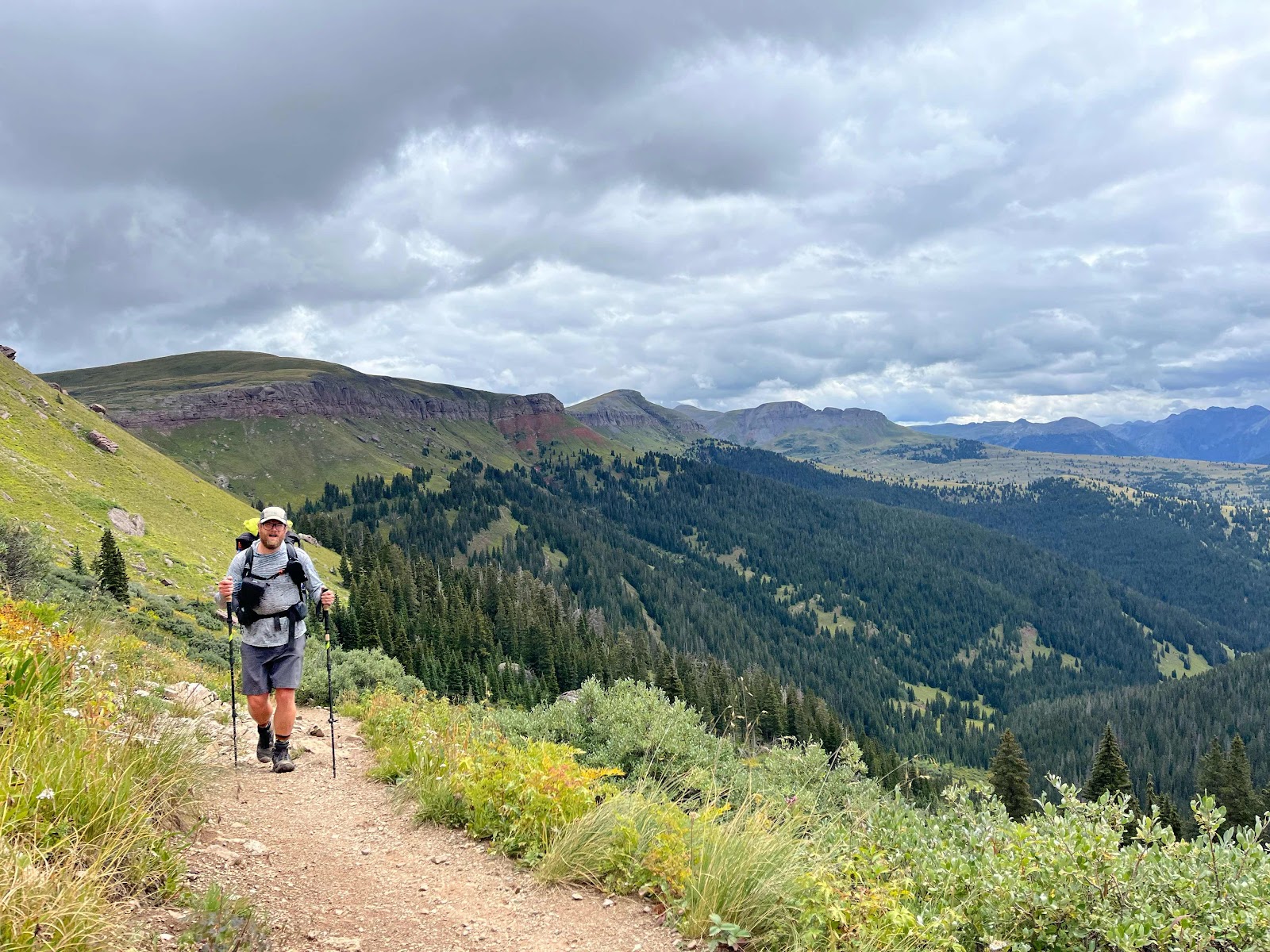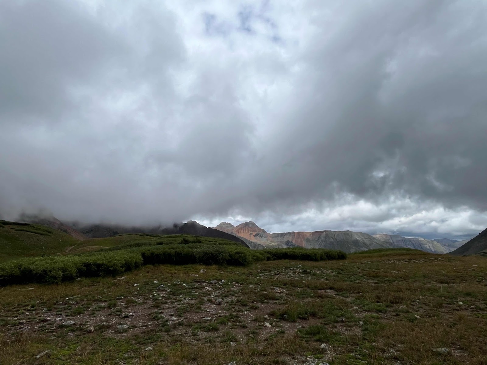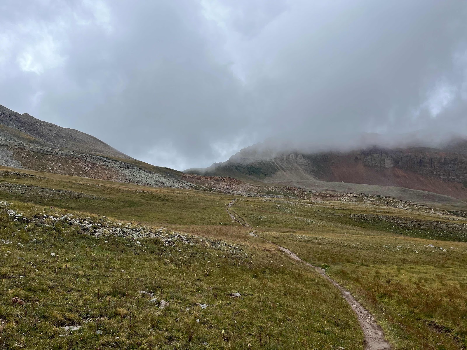 My hands got soaked and were freezing cold even with my rain mitts, and I almost lost full dexterity again in my pinky and ring fingers. I am stoked to be done with this trail soon! I caught Cheeseburgler on the uphilll towards the next pass. Luckily, the weather started clearing up nearing the top and we even had some sunshine on the other side!