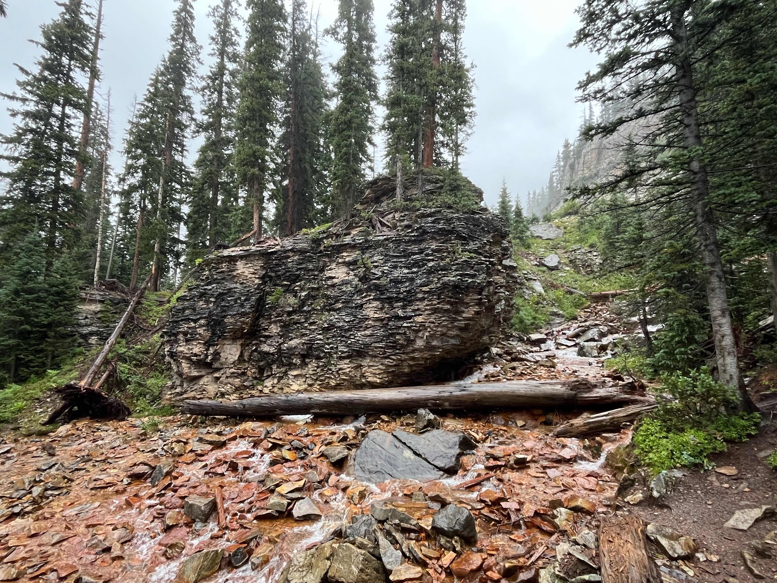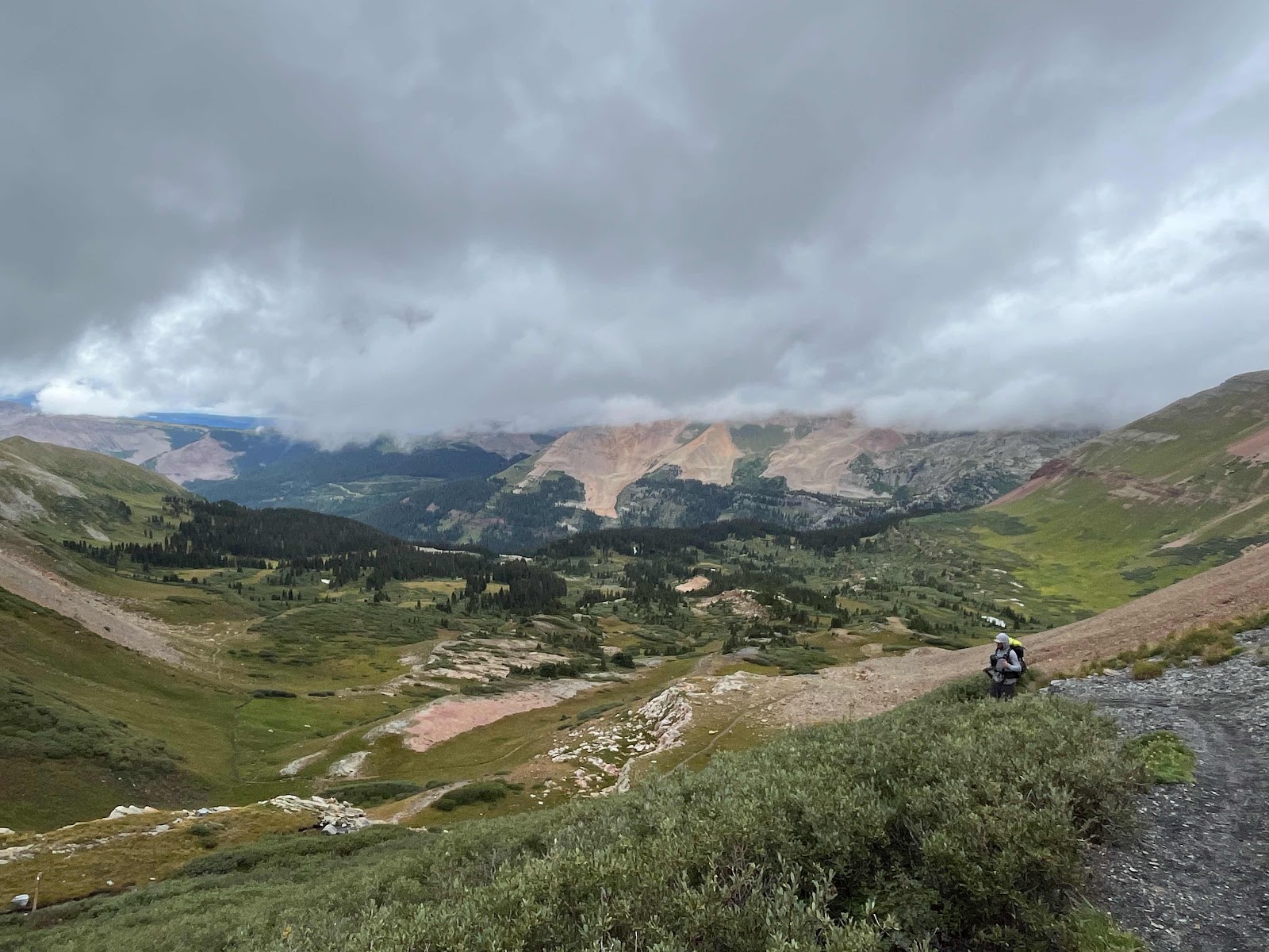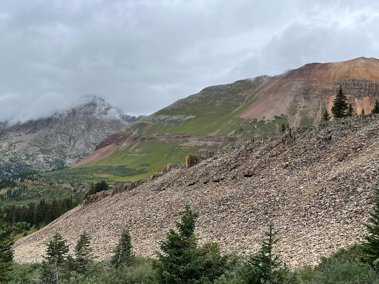 That last area was so gorgeous! It’s really hard to tell with the overcast day, but a lot of those rocks had blues, greens, yellows, oranges, and reds in the mix! We crossed over the pass and started descending. I found a nice big tree about half way down where I stopped to eat some food and pull out some snacks.