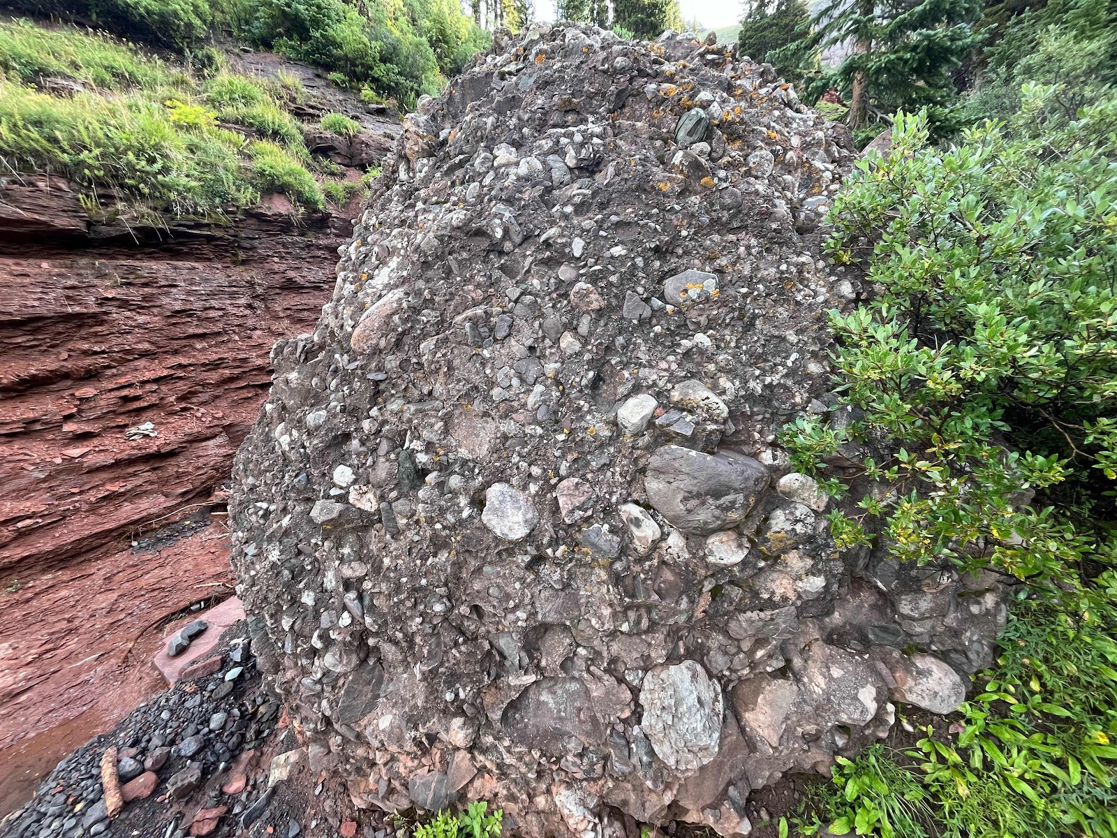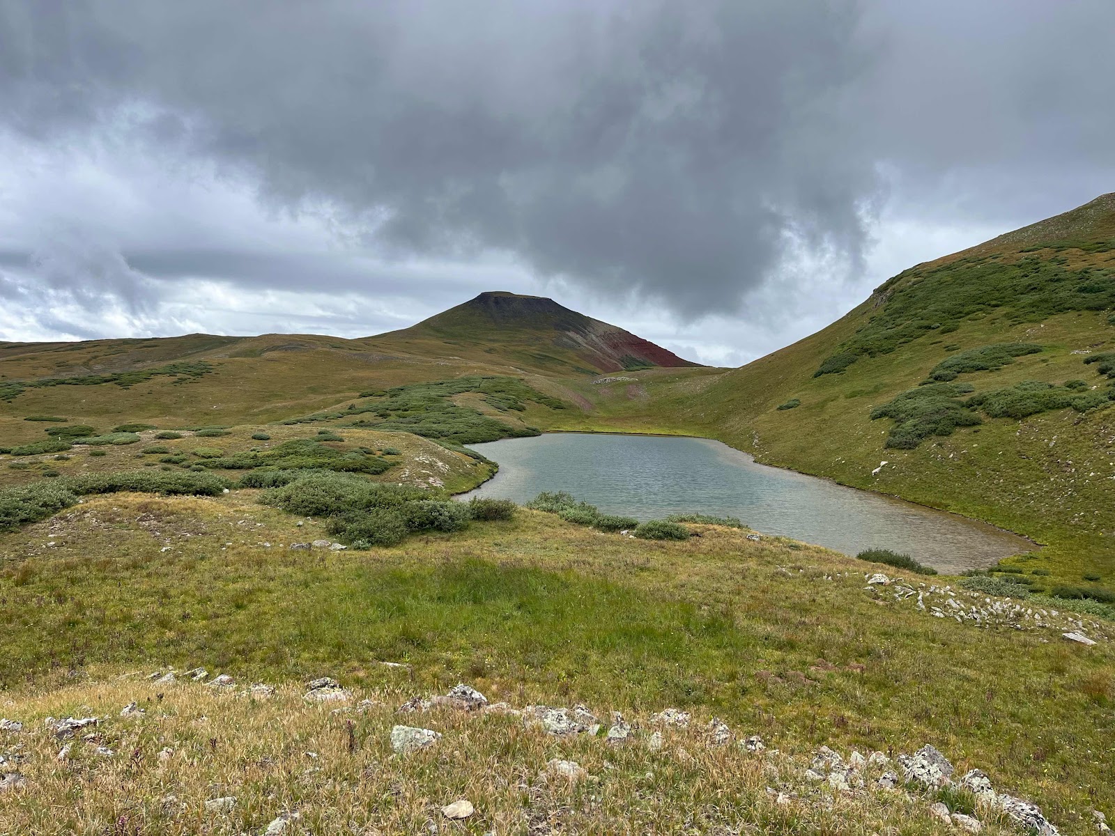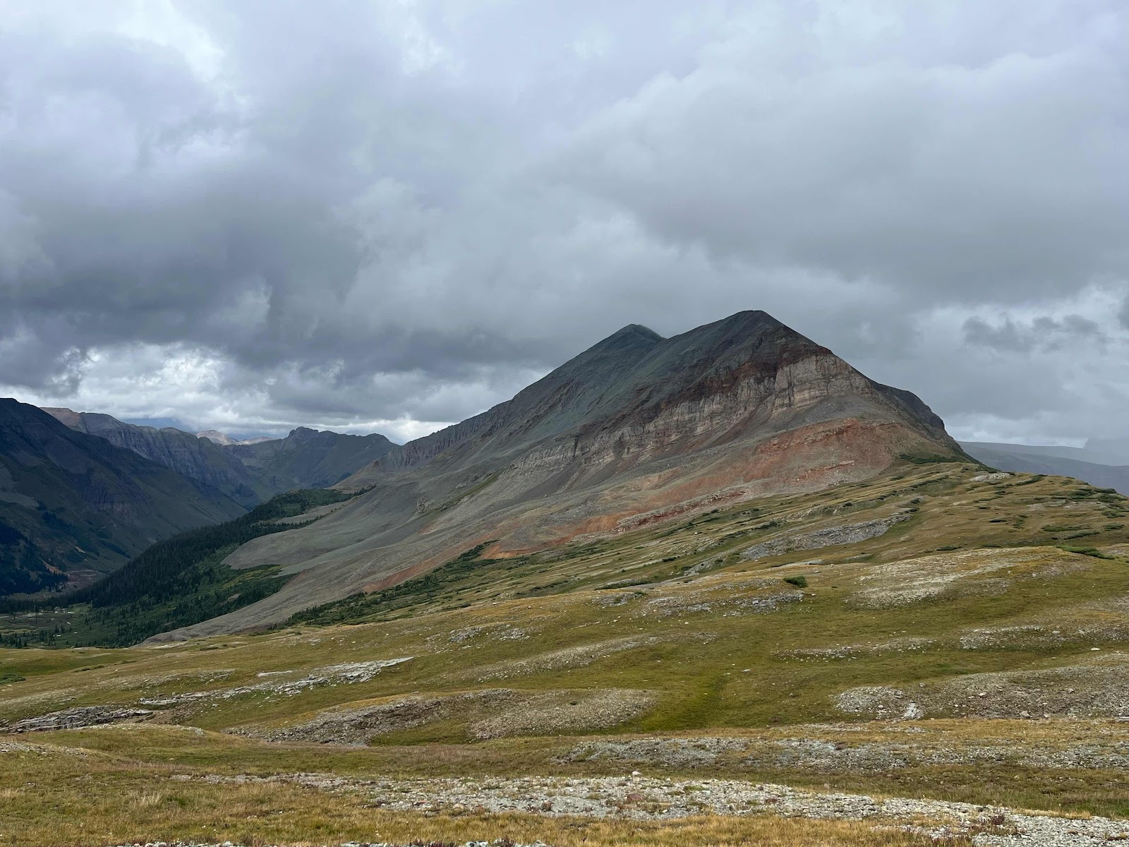 That last area was so gorgeous! It’s really hard to tell with the overcast day, but a lot of those rocks had blues, greens, yellows, oranges, and reds in the mix! We crossed over the pass and started descending. I found a nice big tree about half way down where I stopped to eat some food and pull out some snacks.